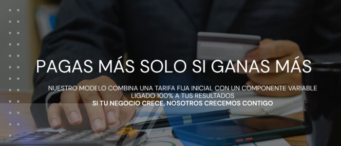 Cobro fijo + variable según resultados reales, alineando intereses con los del cliente.